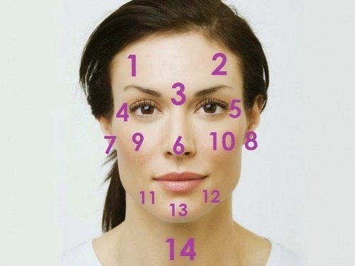 Eğer sivilce ve kızarıklıklara neden olabilecek aybaşı döneminde değilsek veya başka faktörlere maruz kalmamışsak, başka nedenlerden dolayı konuya dikkat etmeliyiz. Yüzümüzün bir harita olduğunu düşünürsek, olası problemleri ve nasıl tedavi edeceğimizi bulabiliriz. Aşağıda yüzünüzün vücutta olanları anlatan 14 bölgesinden bahsedeceğiz. Numaralarla işaretlenmiş bu bölgelere bakın ve problemi anlamaya çalışın.